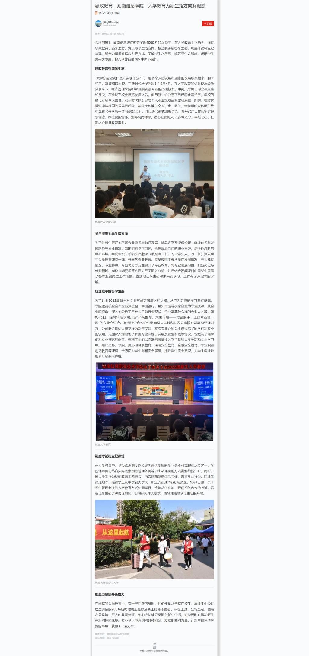 9月16日,学习强国发布《思政教育丨湖南信息职院:入学教育为新生指方向解疑惑》