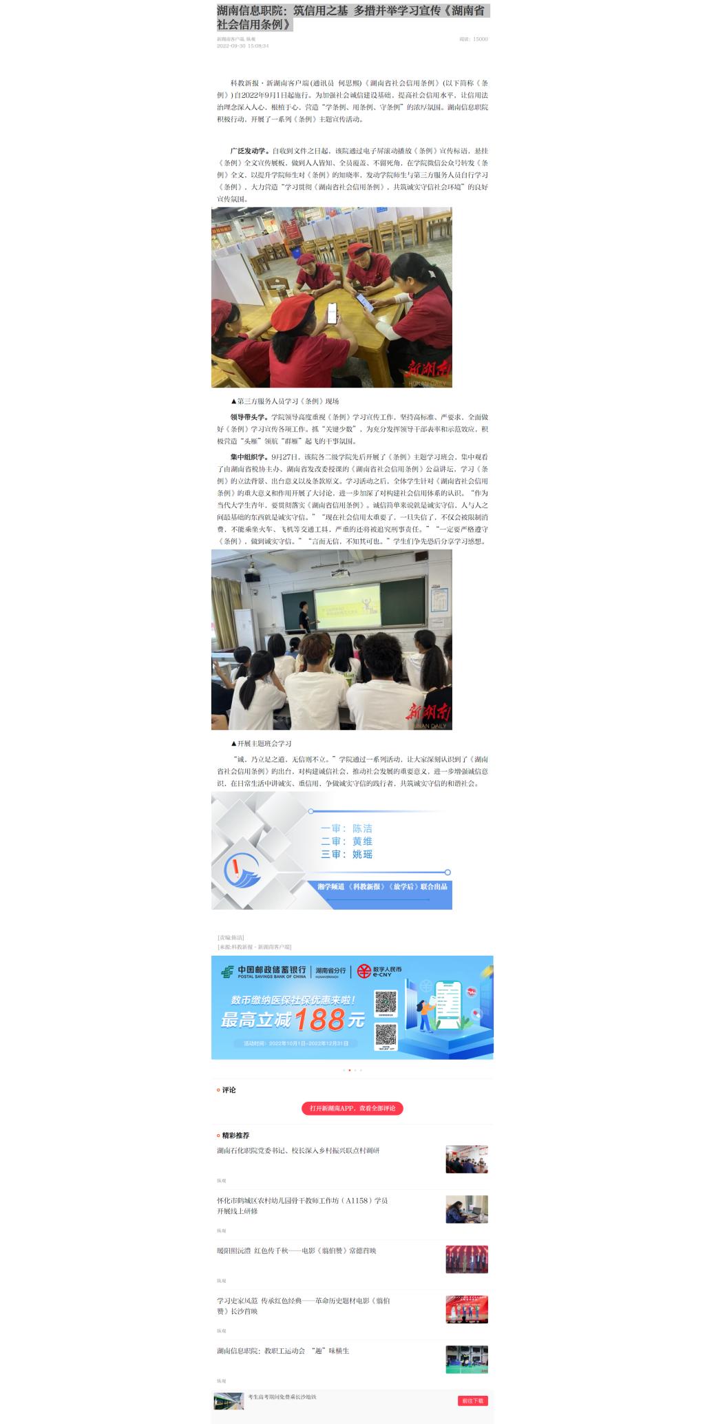 9月30日,新湖南发布《湖南信息职院:筑信用之基 多措并举学习宣传<湖南省社会信用条例>》