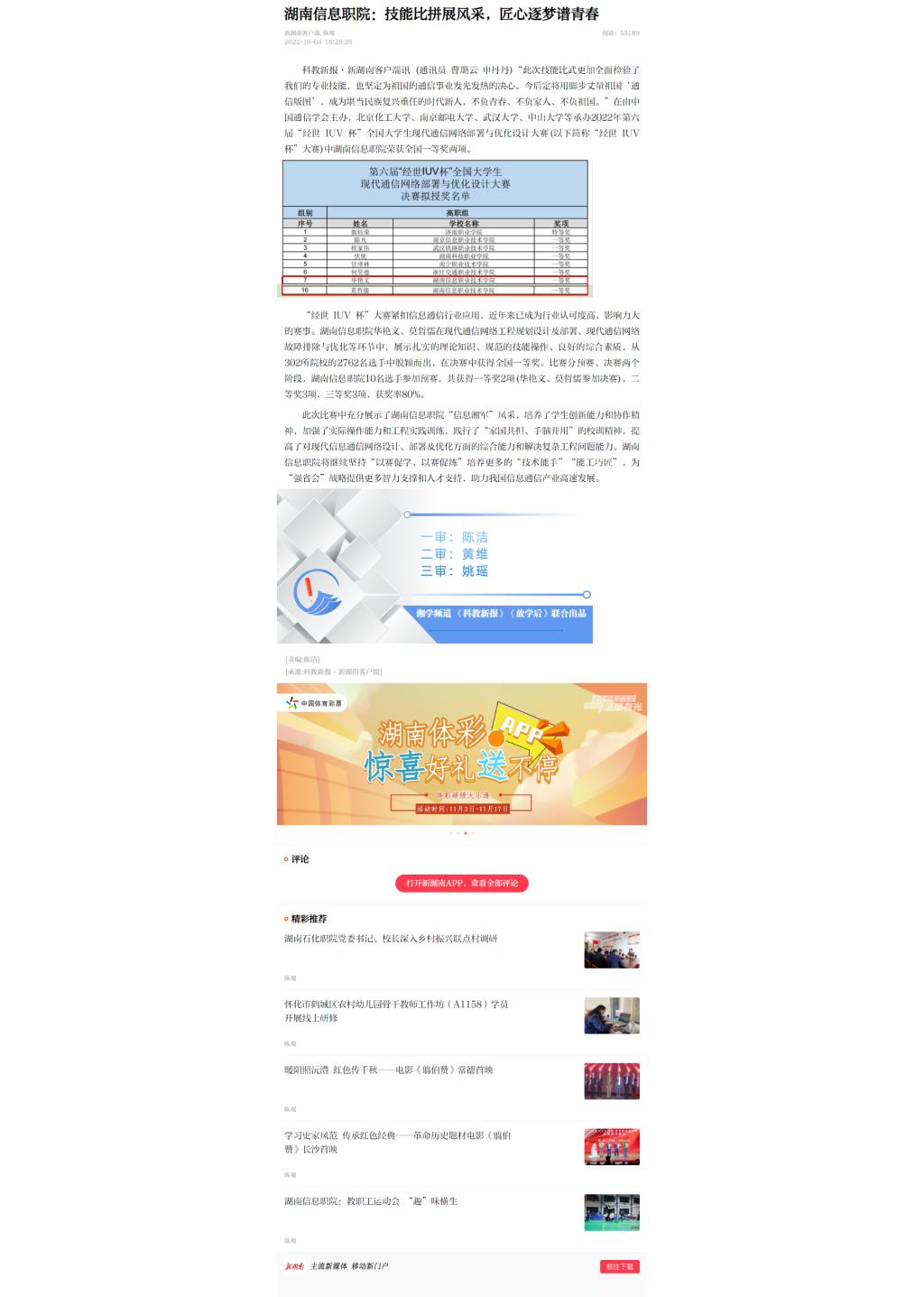 10月4日,新湖南发布《湖南信息职院:技能比拼展风采,匠心逐梦谱青春》
