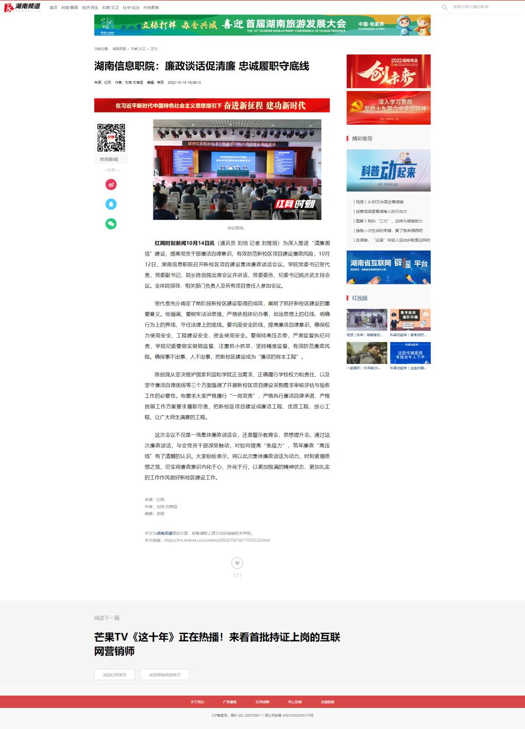 1014日,红网时刻发布《湖南信息职院:廉政谈话促清廉 忠诚履职守底线》