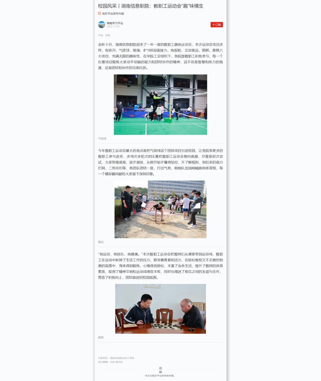 11月07日,学习强国发布《校园风采丨湖南信息职院:教职工运动会“趣”味横生》