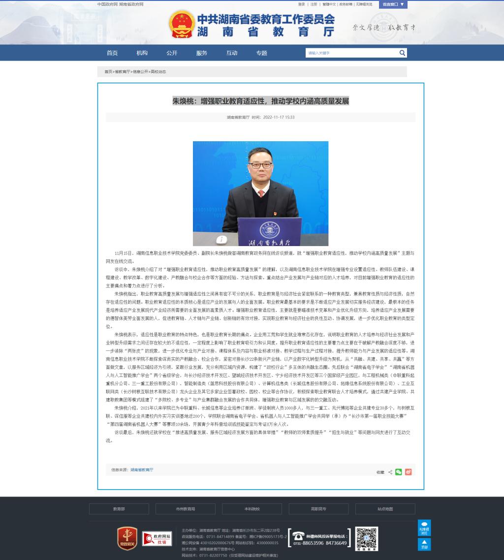 11月17日,湖南省教育厅发布《朱焕桃:增强职业教育适应性,推动学校内涵高质量发展》