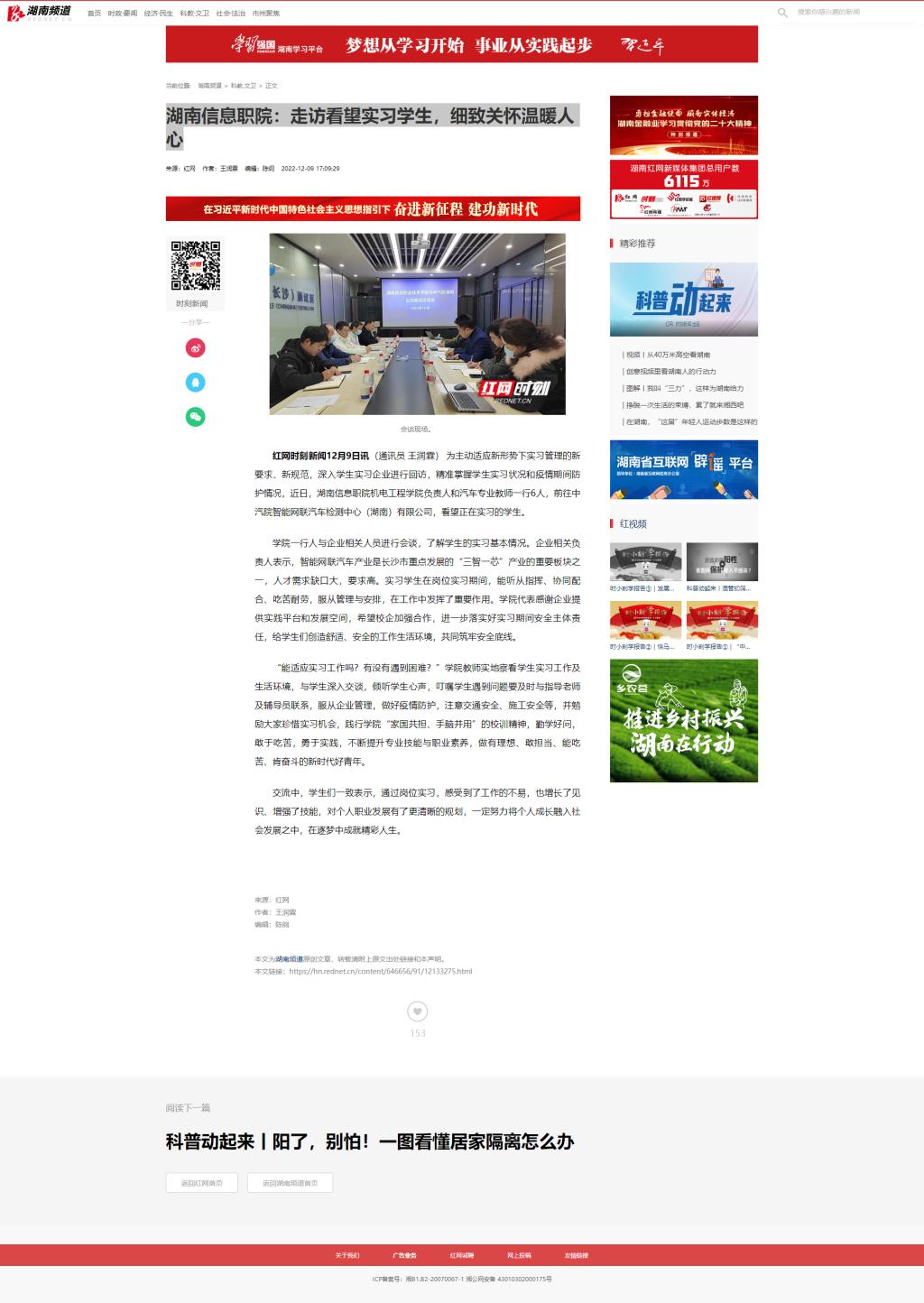 12月9日,红网发布《湖南信息职院:走访看望实习学生,细致关怀温暖人心》