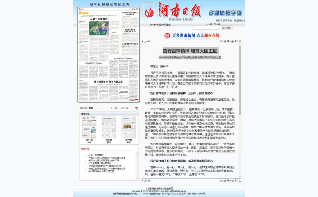 12月20日,湖南日报发布《践行雷锋精神 培育大国工匠——beat365英国官方网站职业教育发展改革成果巡礼之三》