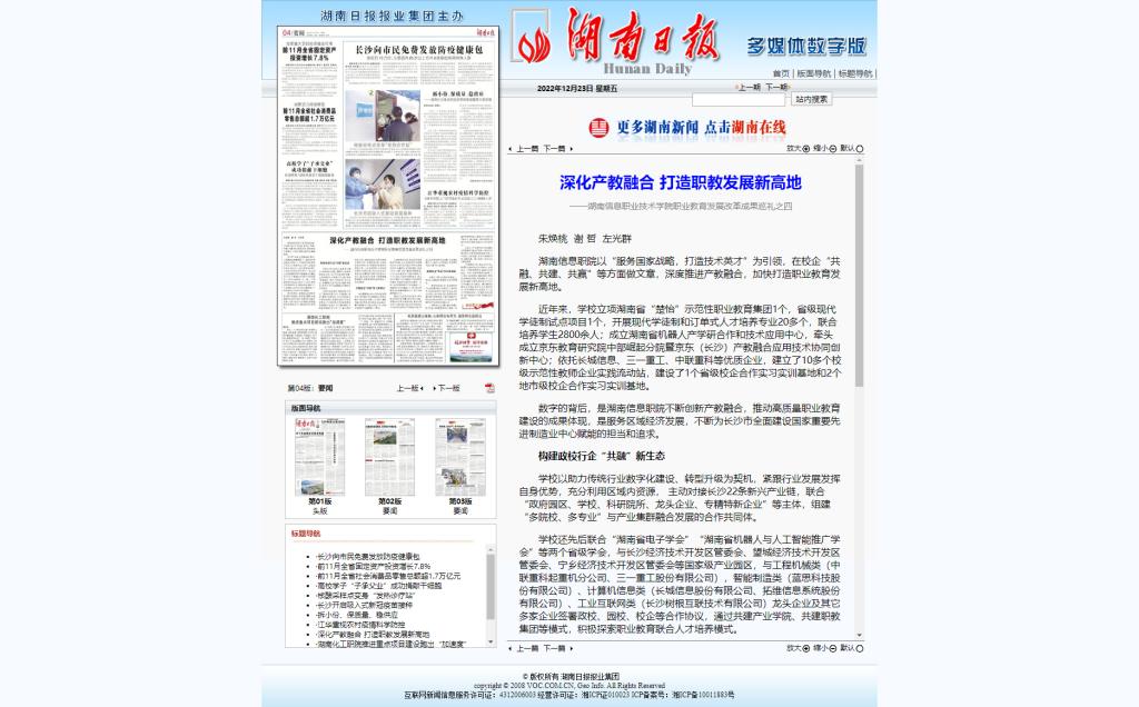12月23日,湖南日报发布《深化产教融合 打造职教发展新高地——beat365英国官方网站职业教育发展改革成果巡礼之四》