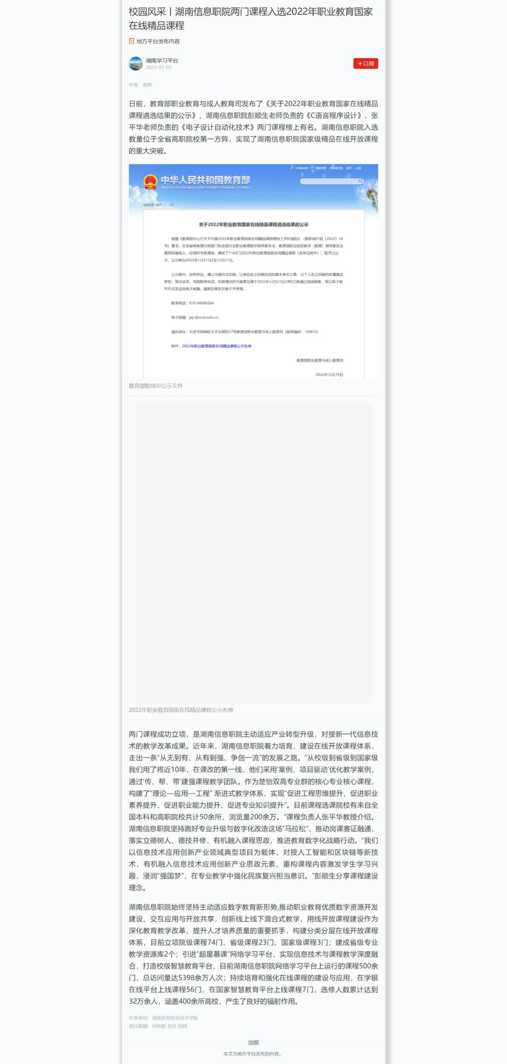 1月3日,学习强国发布《校园风采丨湖南信息职院两门课程入选2022年职业教育国家在线精品课程》