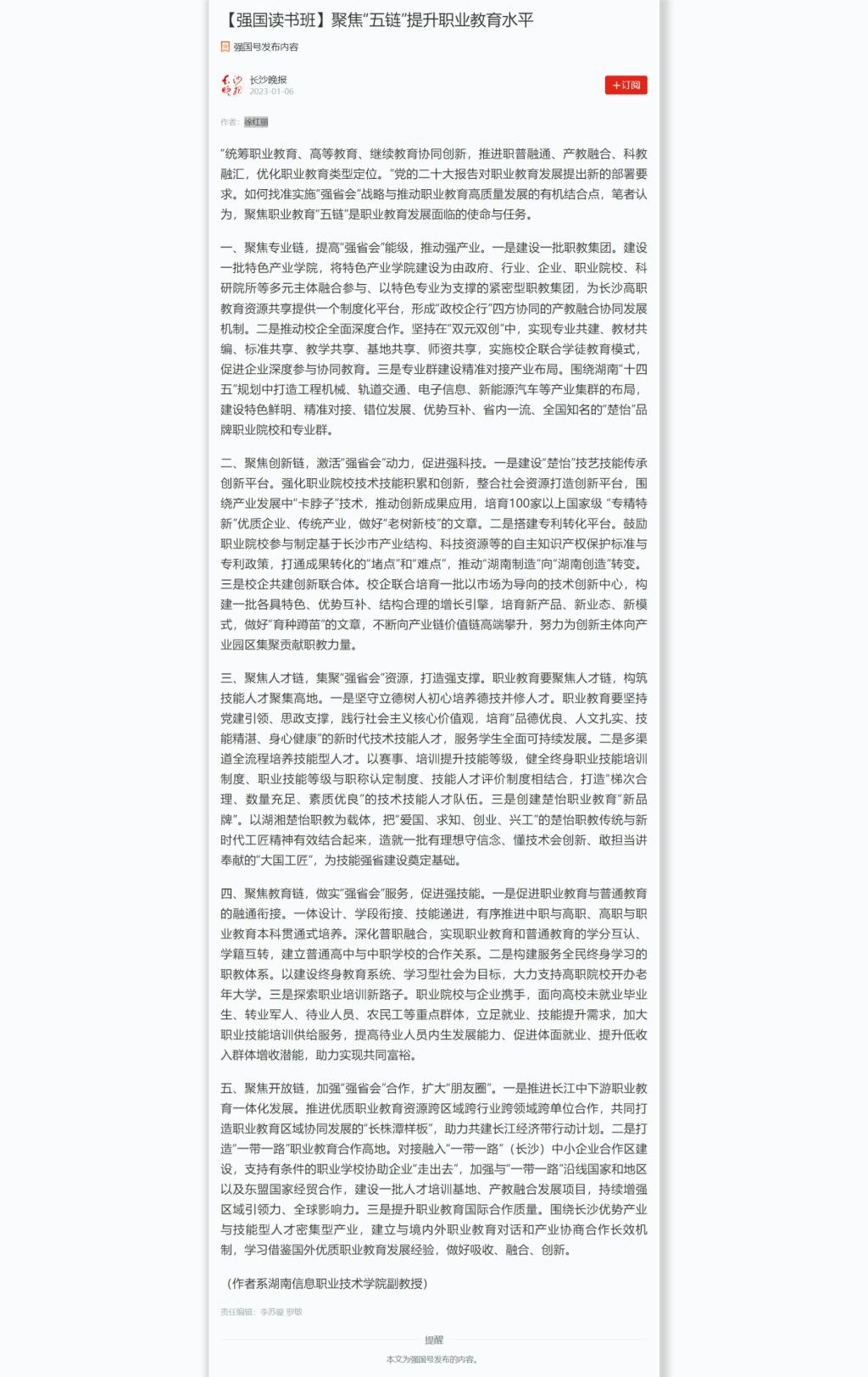 1月6日,学习强国发布《【强国读书班】聚焦“五链”提升职业教育水平》
