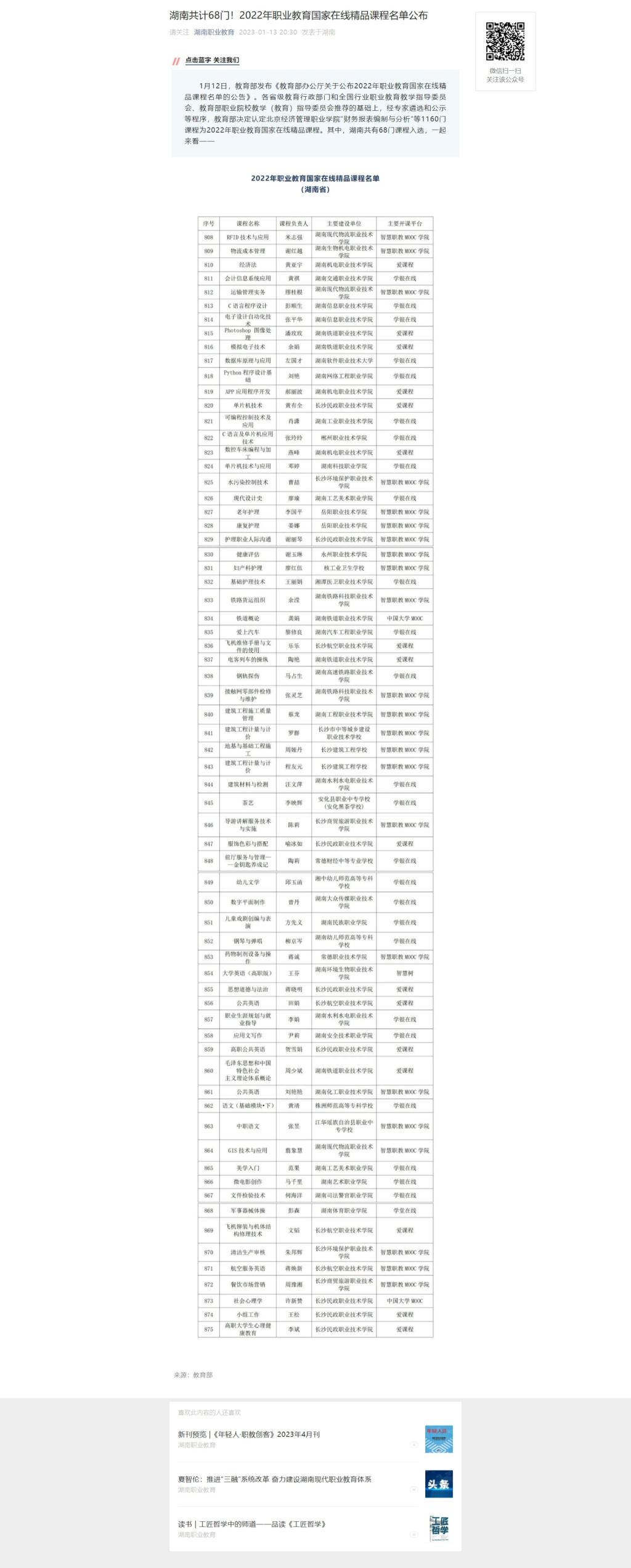 1月13日,微信(湖南职业教育)发布《湖南共计68门!2022年职业教育国家在线精品课程名单公布》