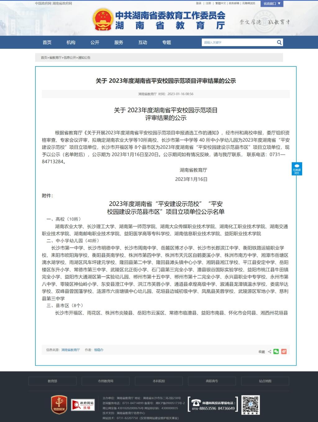 1月16日,湖南省教育厅发布《关于 2023年度湖南省平安校园示范项目评审结果的公示》