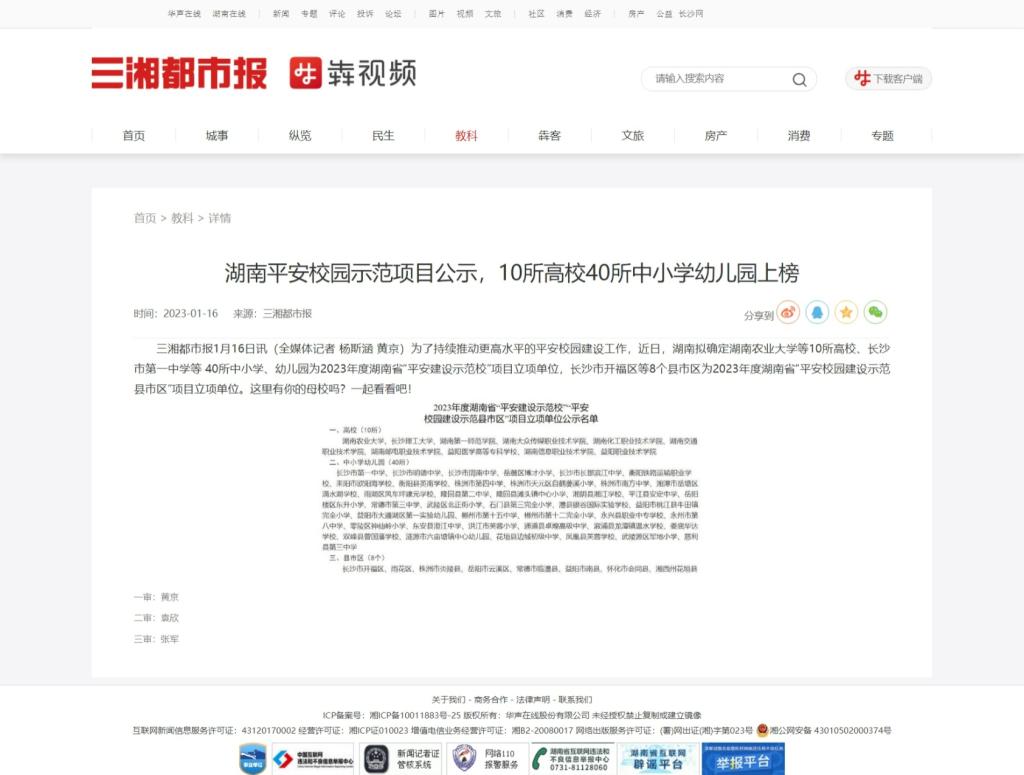 1月16日,三湘都市报发布《湖南平安校园示范项目公示,10所高校40 所中小学幼儿园上榜》