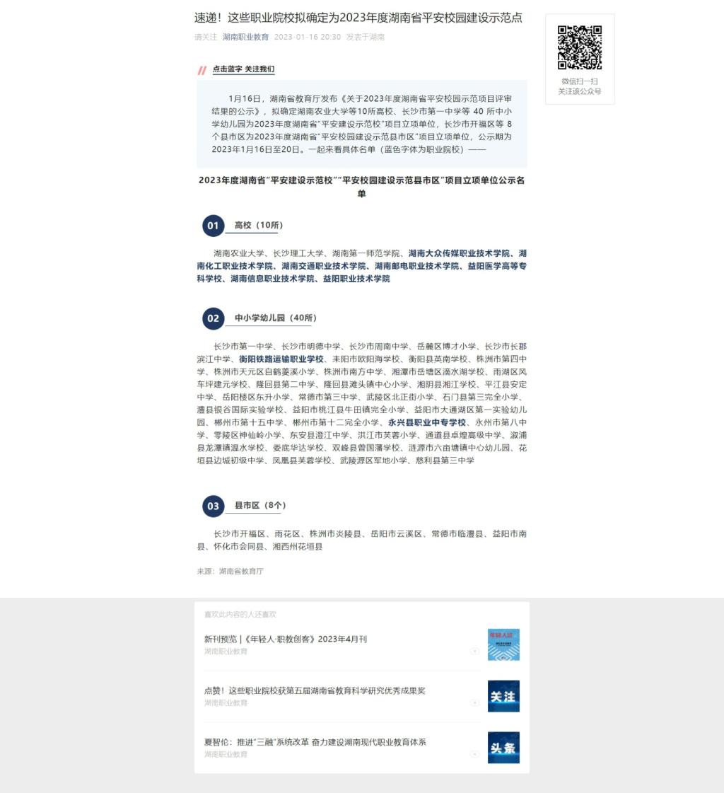 1月6日,微信(湖南职业教育)发布《速递!这些职业院校拟确定为2023年度湖南省平安校园建设示范点》