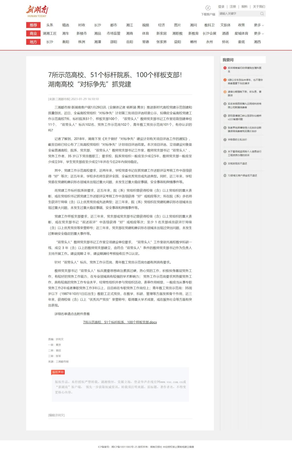 1月29日,新湖南发布《7所示范高校、51个标杆院系、100个样板支部!湖南高校“对标争先”抓党建》