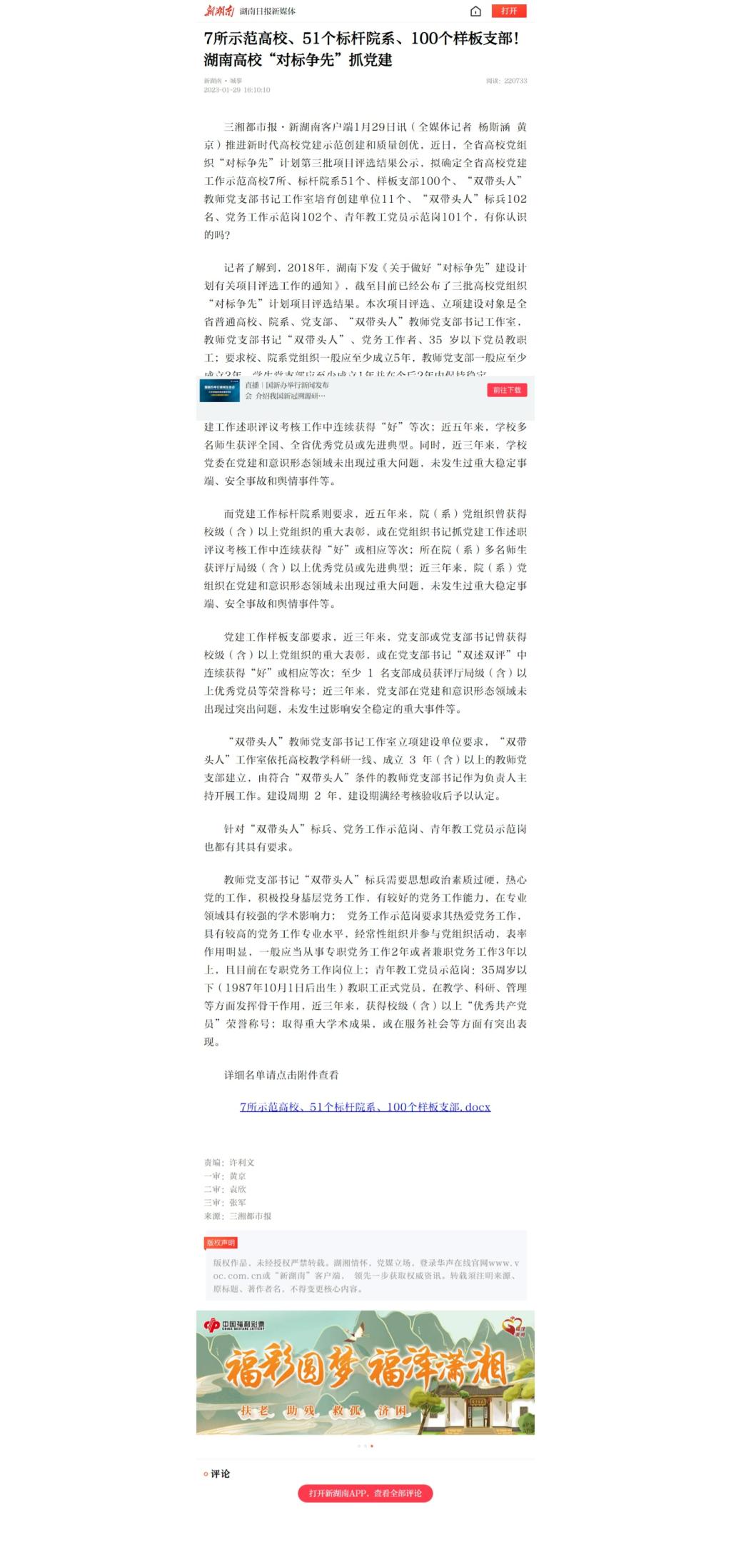 1月29日,新湖南客户端发布《7所示范高校、51个标杆院系、100个样板支部!湖南高校“对标争先”抓党建》