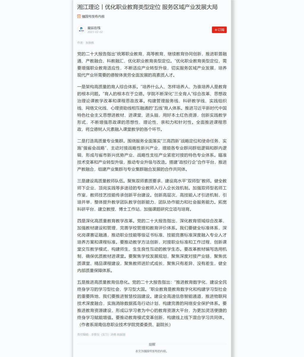 2月2日,学习强国发布《湘江理论丨优化职业教育类型定位 服务区域产业发展大局》