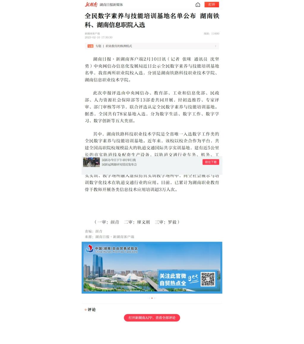 2月10日,新湖南客户端发布《全民数字素养与技能培训基地名单公布 湖南铁科、湖南信息职院入选》