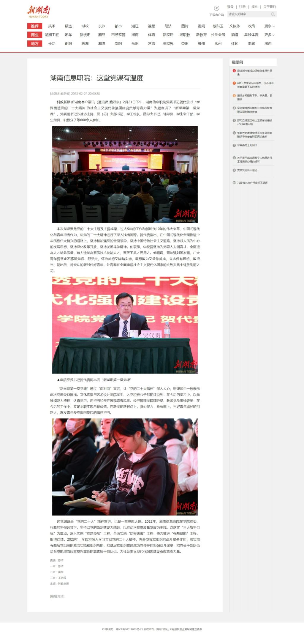 2月24日,新湖南发布《湖南信息职院:这堂党课有温度》