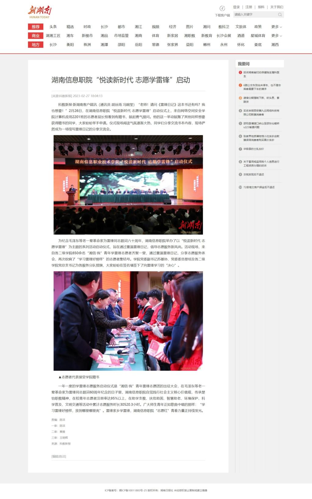2月27日,新湖南发布《湖南信息职院“悦读新时代 志愿学雷锋”启动》