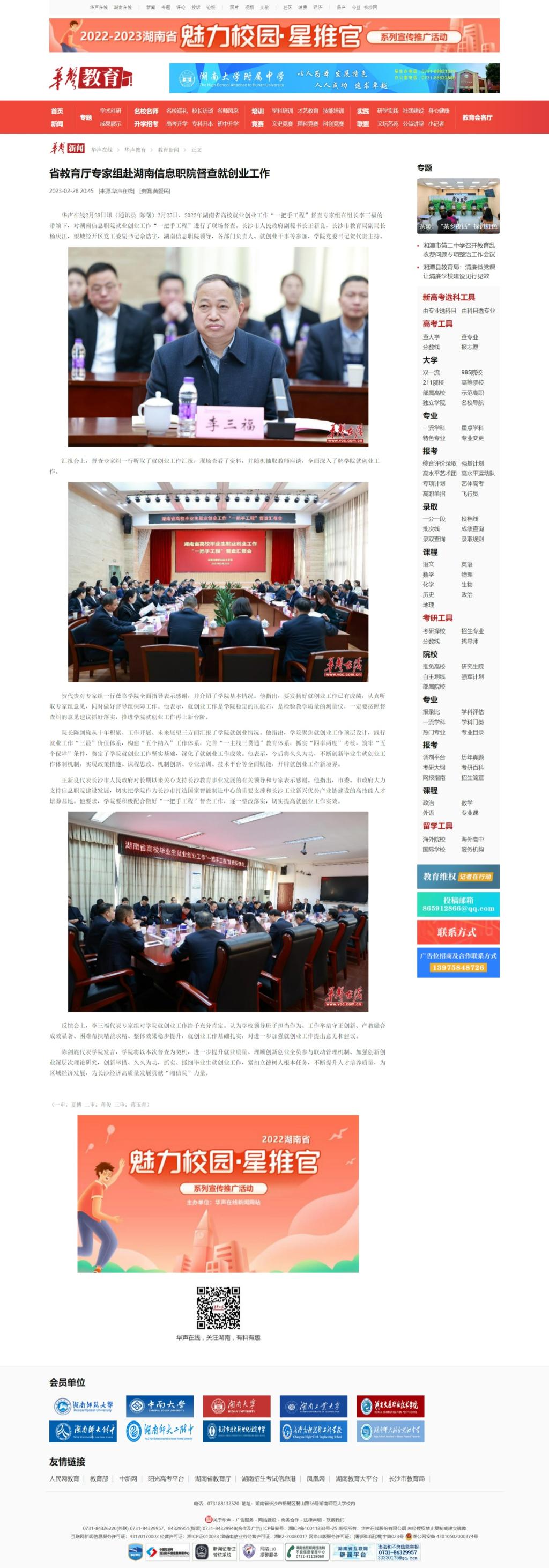 2月28日,华声在线发布《省教育厅专家组赴湖南信息职院督查就创业工作》