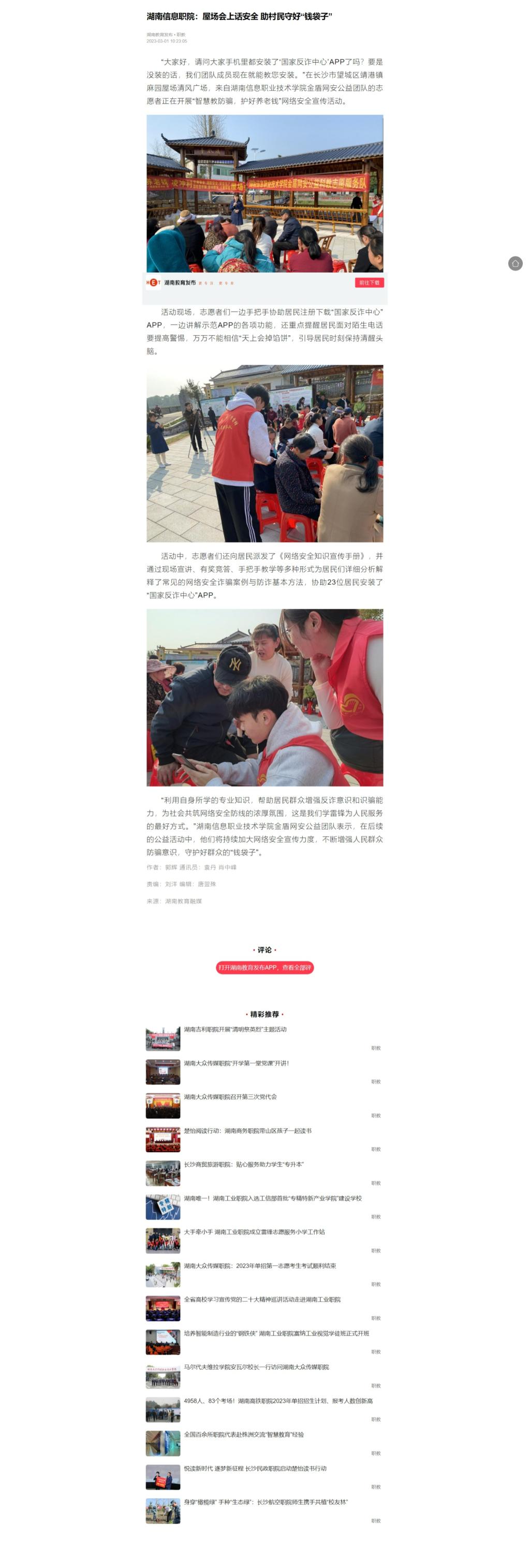 3月1日,湖南教育发布客户端发布《湖南信息职院:屋场会上话安全 助村民守好“钱袋子”》