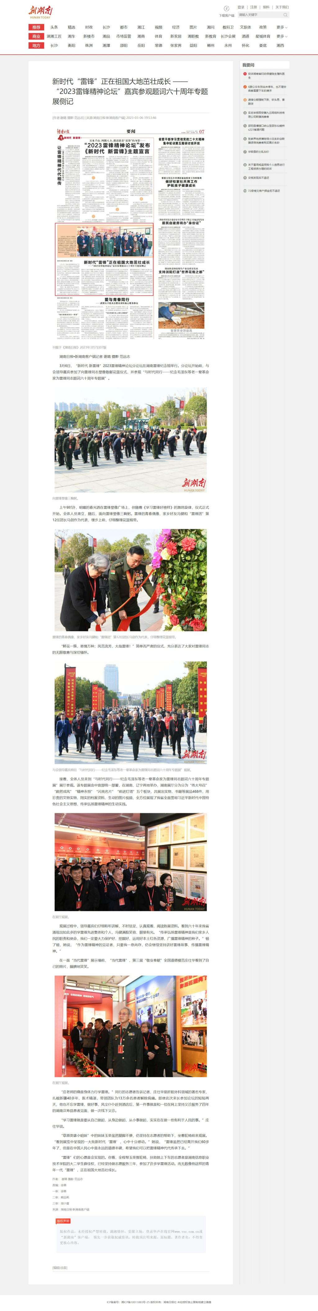 3月6日,新湖南发布《“雷锋”正在祖国大地茁壮成长 ——“2023雷锋精神论坛”嘉宾参观题词六十周年专题展侧记》