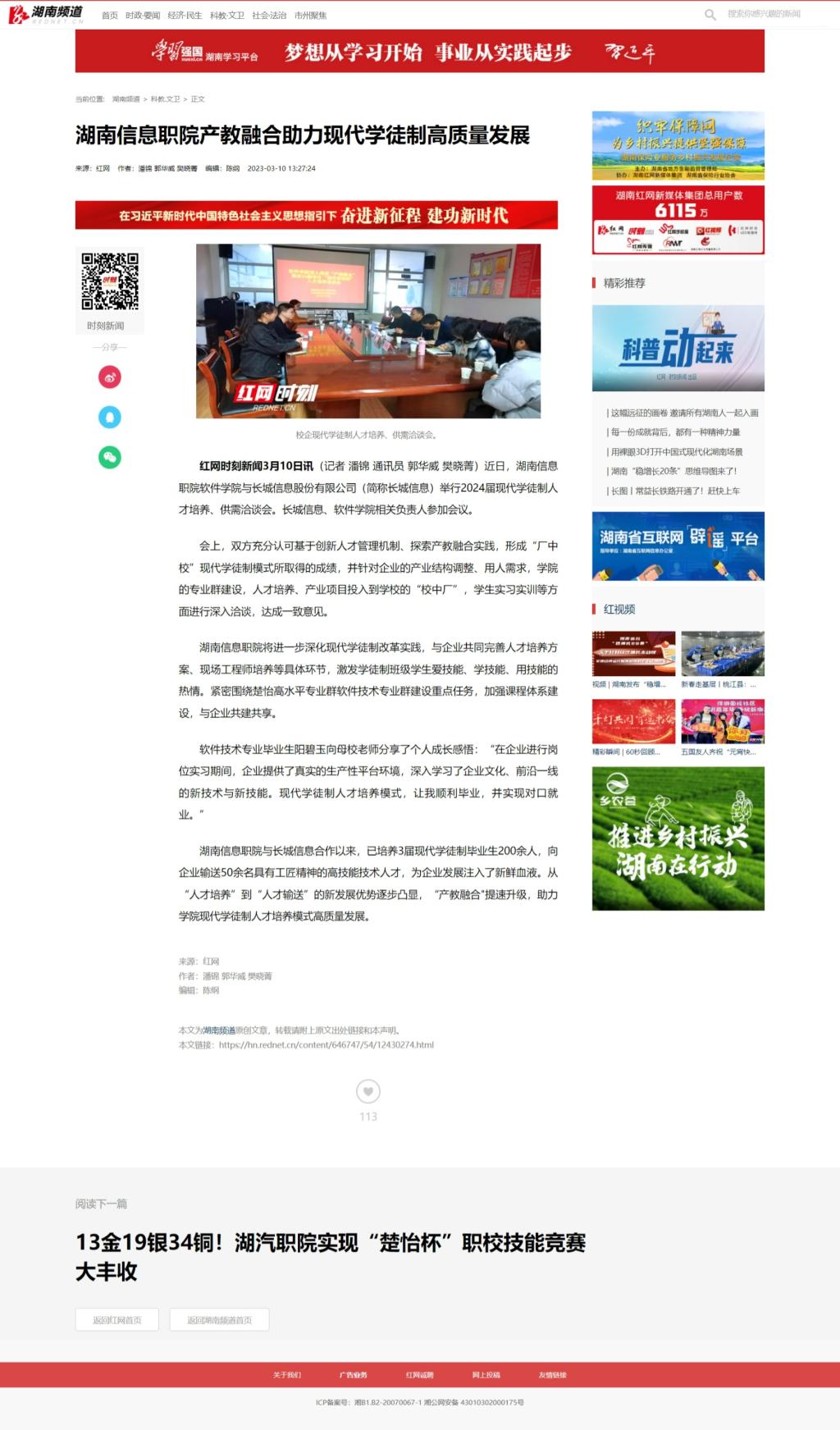 3月10日,红网发布《湖南信息职院产教融合助力现代学徒制高质量发展》