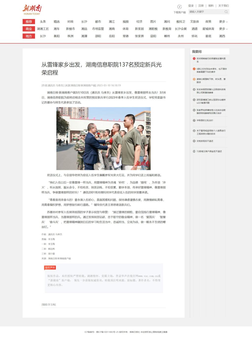 3月10日,新湖南发布《从雷锋家乡出发,湖南信息职院137名预定新兵光荣启程》
