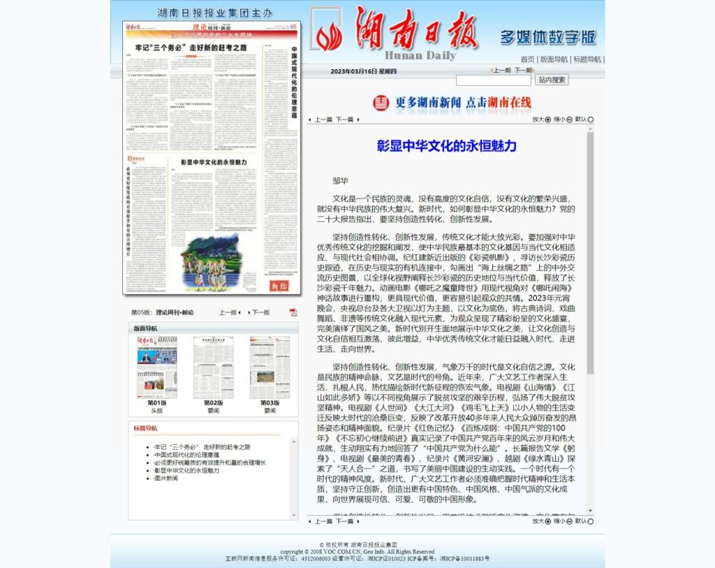 3月16日,湖南日报发布《彰显中华文化的永恒魅力》