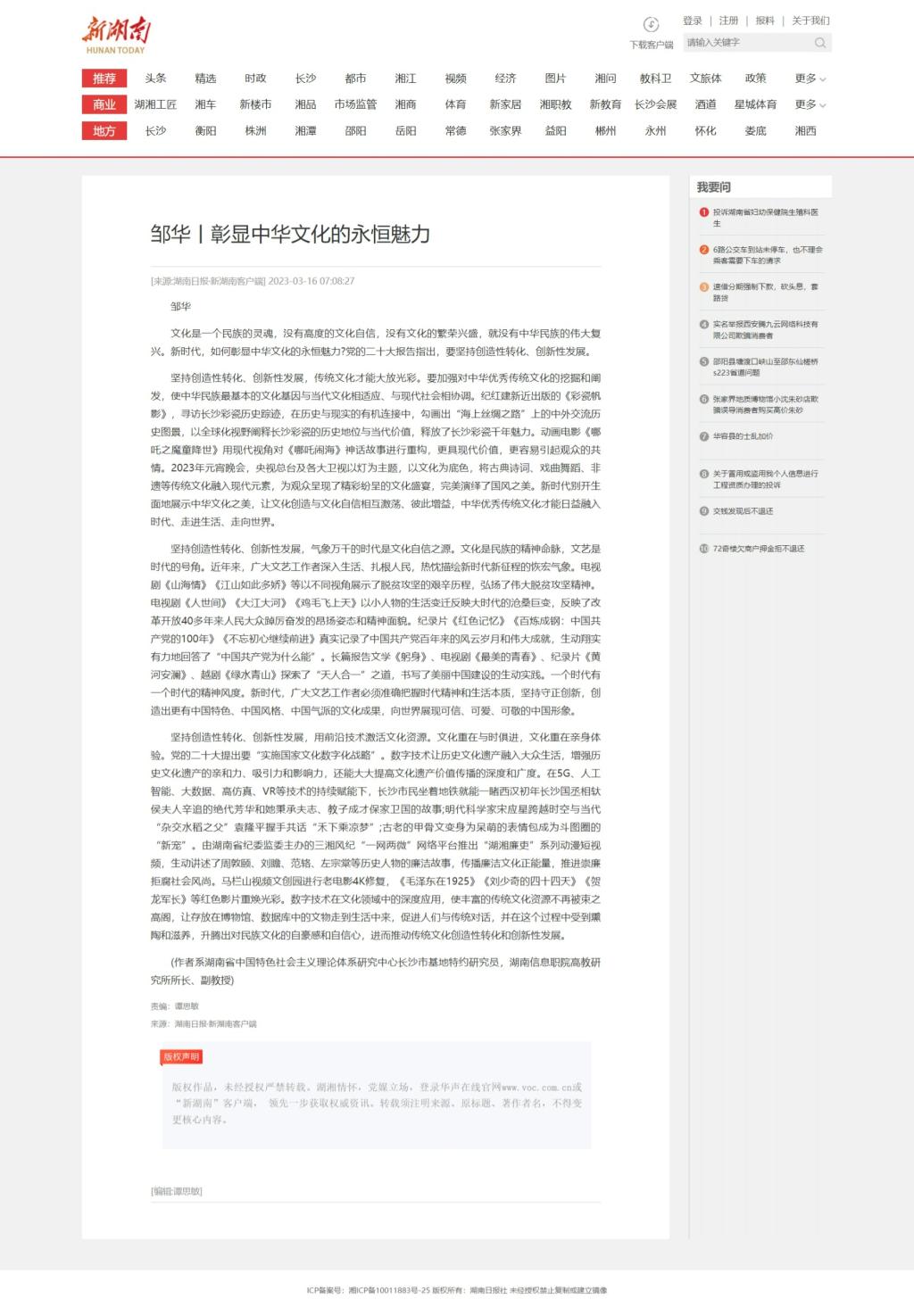 3月16日,新湖南发布《深入学习贯彻党的二十大精神丨彰显中华文化的永恒魅力》