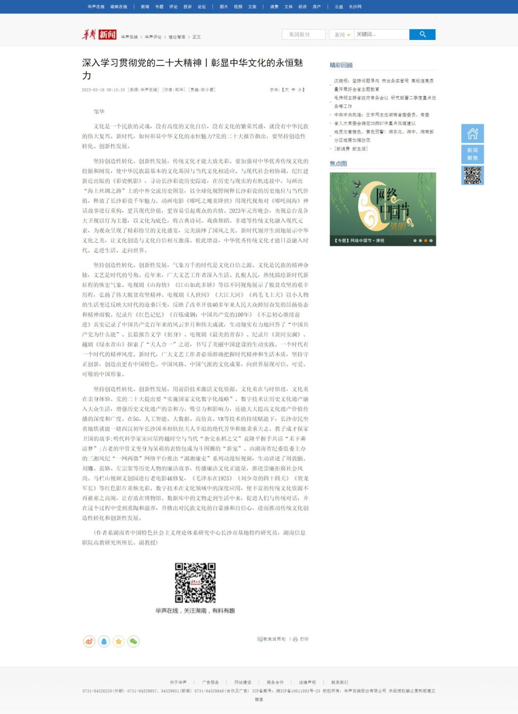 3月16日,华声在线发布《深入学习贯彻党的二十大精神丨彰显中华文化的永恒魅力》