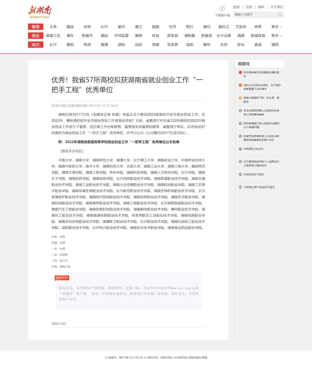3月17日,新湖南发布《优秀!我省57所高校拟获湖南省就业创业工作“一把手工程”优秀单位》