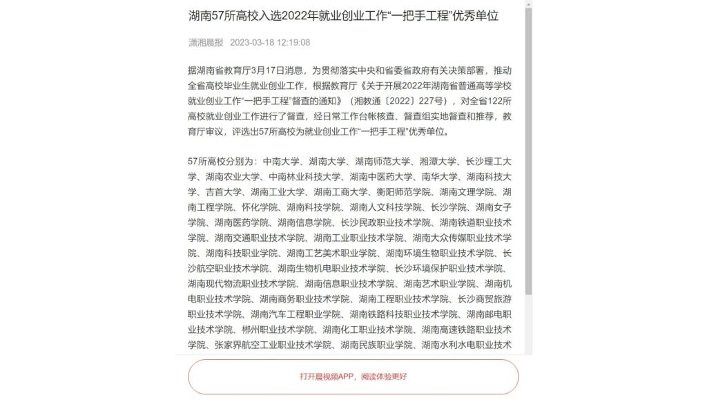 3月18日,晨视频发布《湖南57所高校入选2022年就业创业工作“一把手工程”优秀单位》