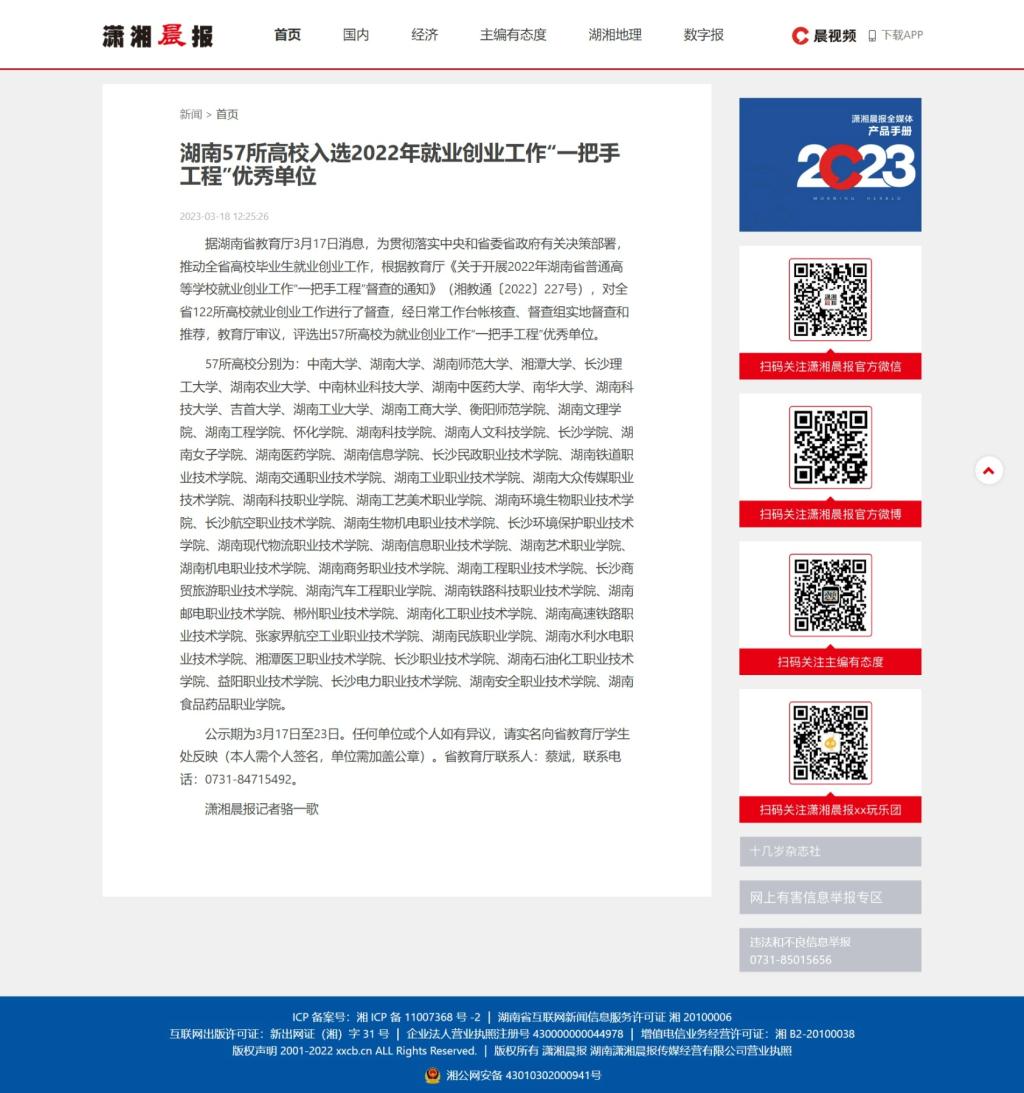 3月18日,潇湘晨报网发布《湖南57所高校入选2022年就业创业工作“一把手工程”优秀单位》