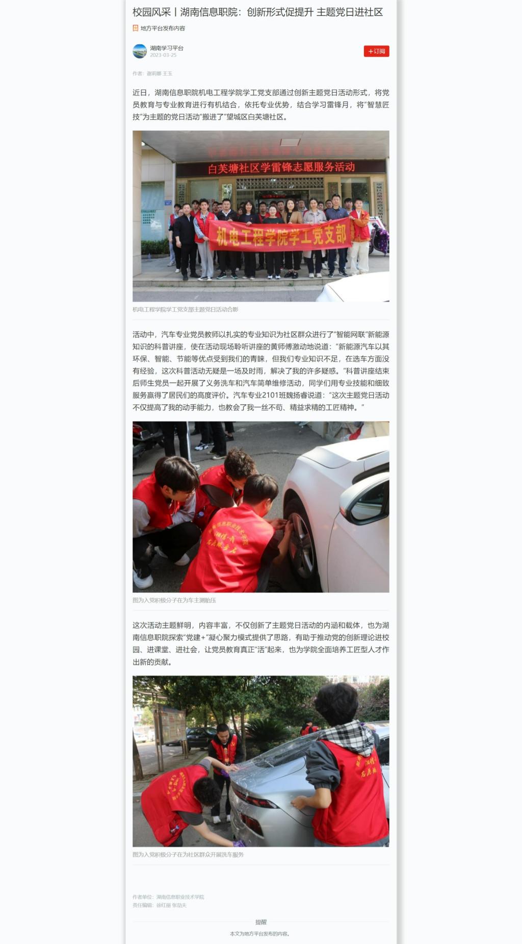 3月25日,学习强国发布《校园风采丨湖南信息职院:创新形式促提升 主题党日进社区》