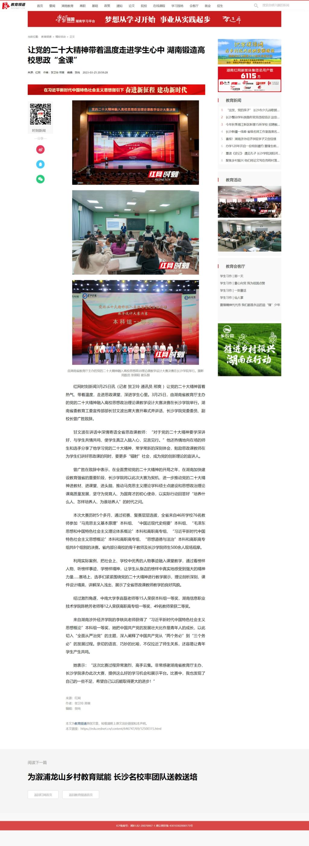 3月25日,红网发布《让党的二十大精神带着温度走进学生心中 湖南锻造高校思政“金课”》