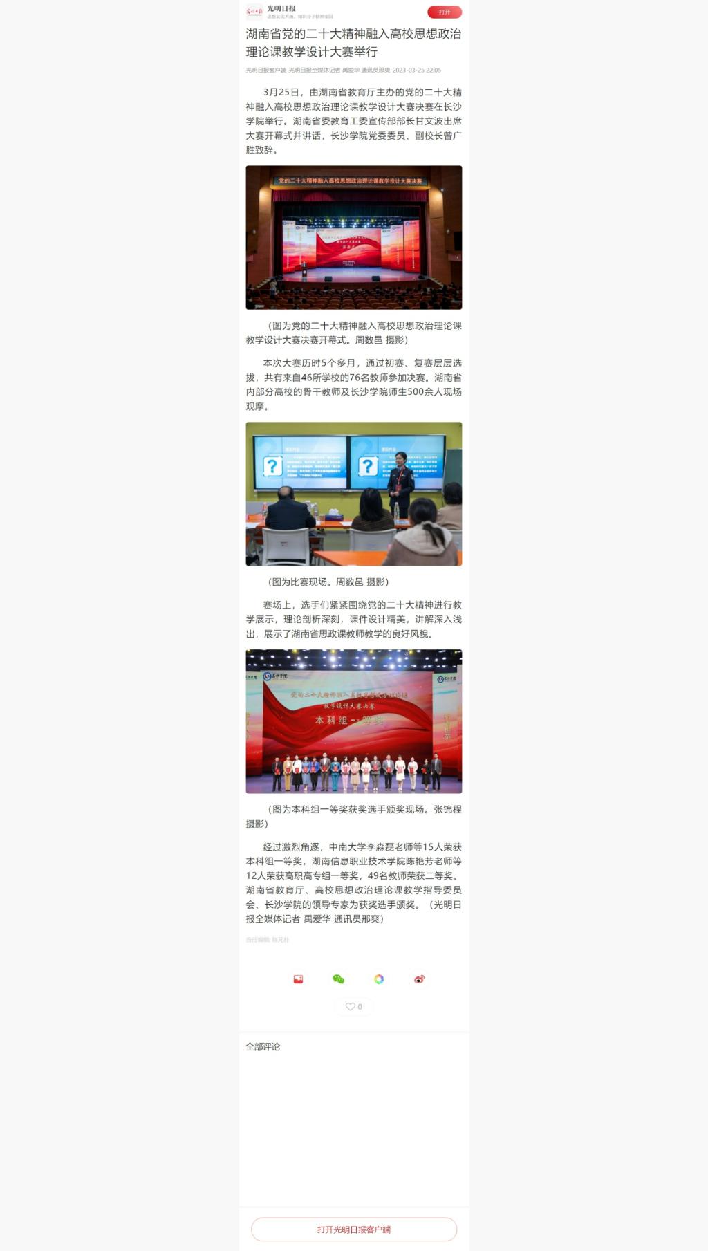 3月25日,光明日报客户端发布《湖南省党的二十大精神融入高校思想政治理论课教学设计大赛举行》