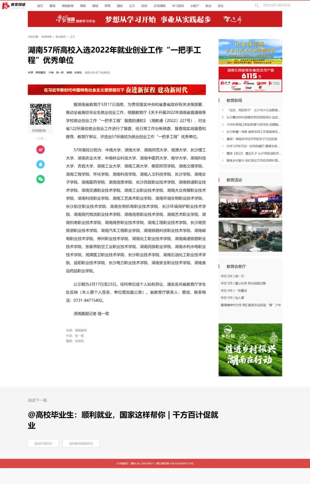 3月27日,红网发布《湖南57所高校入选2022年就业创业工作“一把手工程”优秀单位》