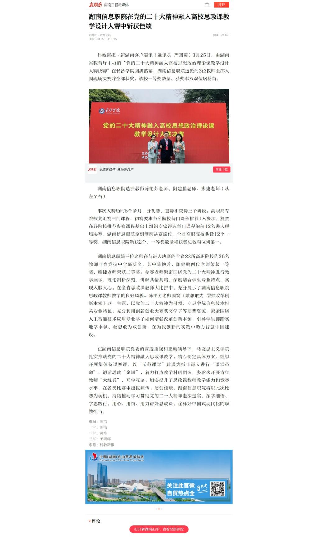 3月27日,新湖南客户端发布《湖南信息职院在党的二十大精神融入高校思政课教学设计大赛中斩获佳绩》