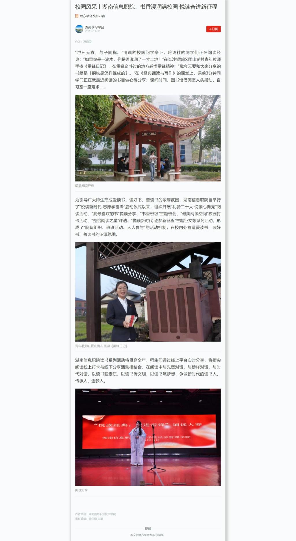 3月30日,学习强国发布《校园风采丨湖南信息职院:书香浸润满校园 悦读奋进新征程》