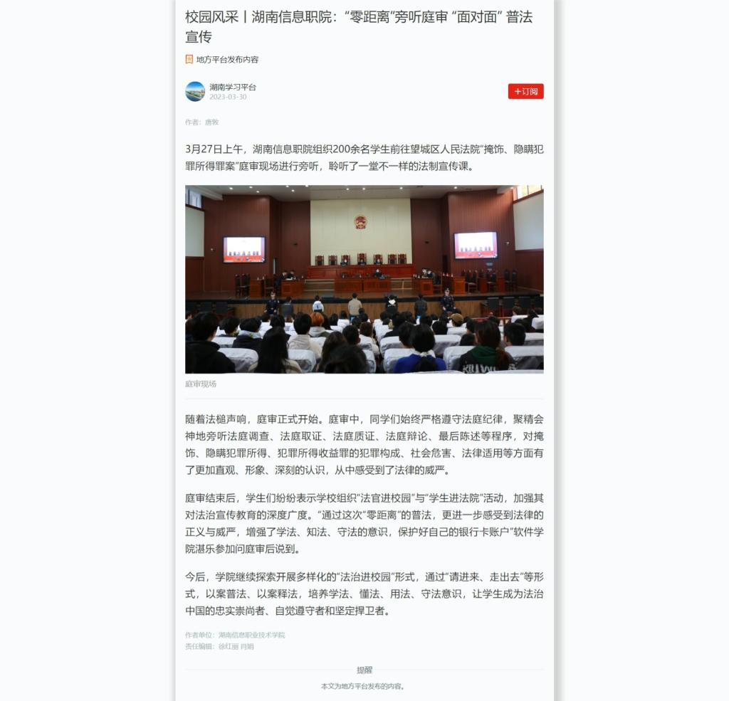 3月30日,学习强国发布《校园风采丨湖南信息职院:“零距离”旁听庭审 “面对面” 普法宣传》