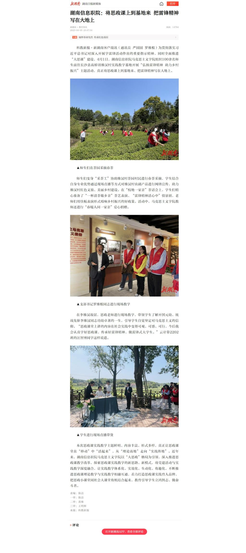 4月5日,新湖南客户端发表《湖南信息职院:将思政课上到基地来 把雷锋精神写在大地上》