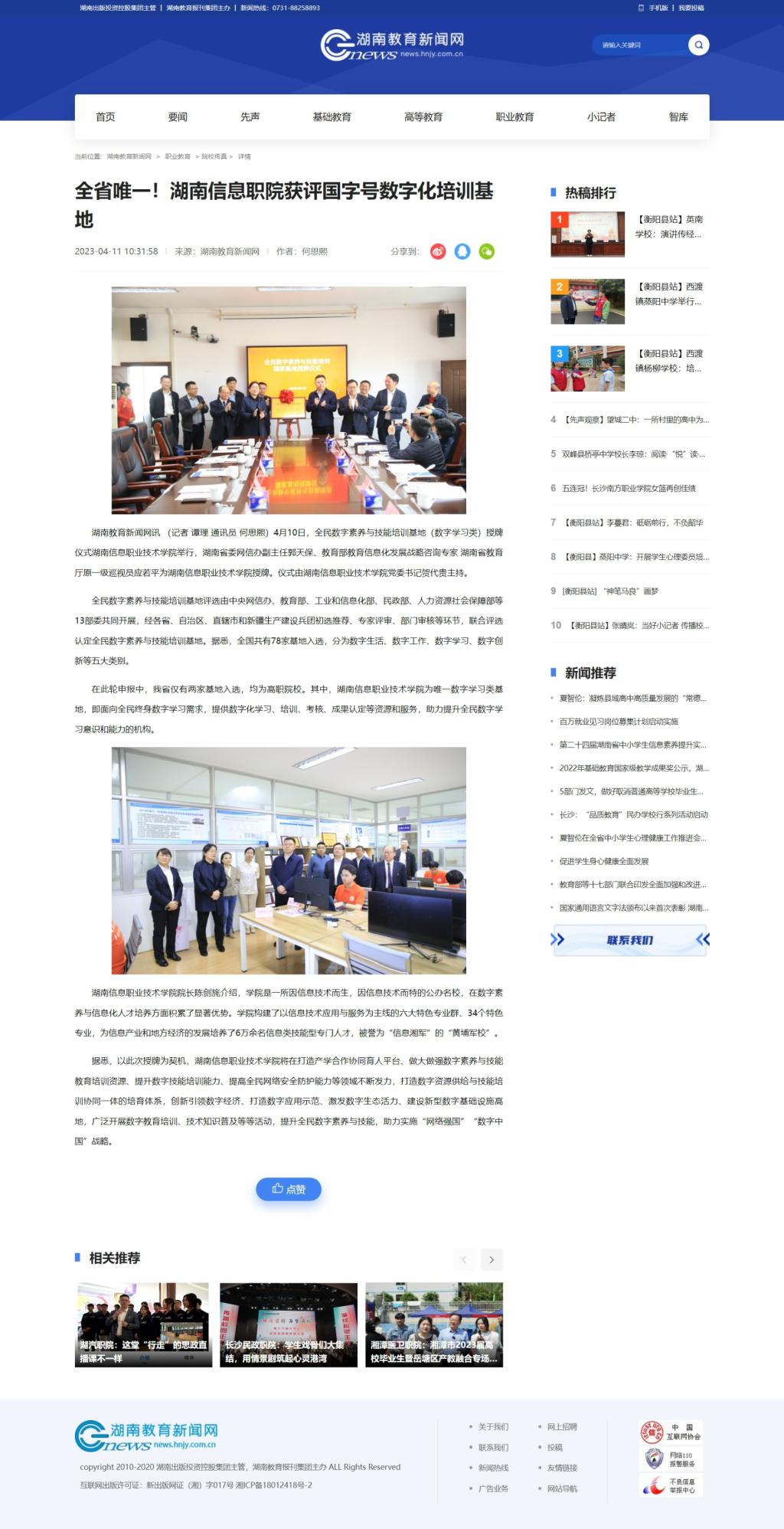 4月11日,湖南教育新闻网发表《全省唯一!湖南信息职院获评国字号数字化培训基地》