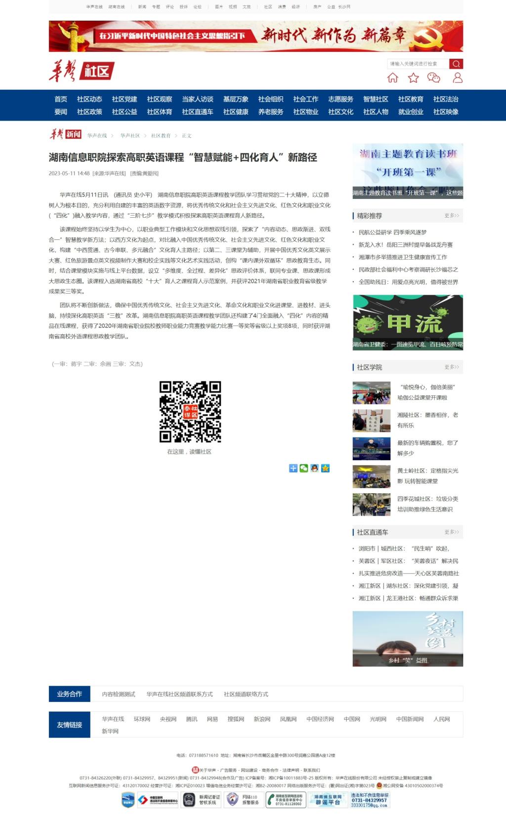 5月11日,华声在线发布《湖南信息职院探索高职英语课程“智慧赋能+四化育人”新路径》