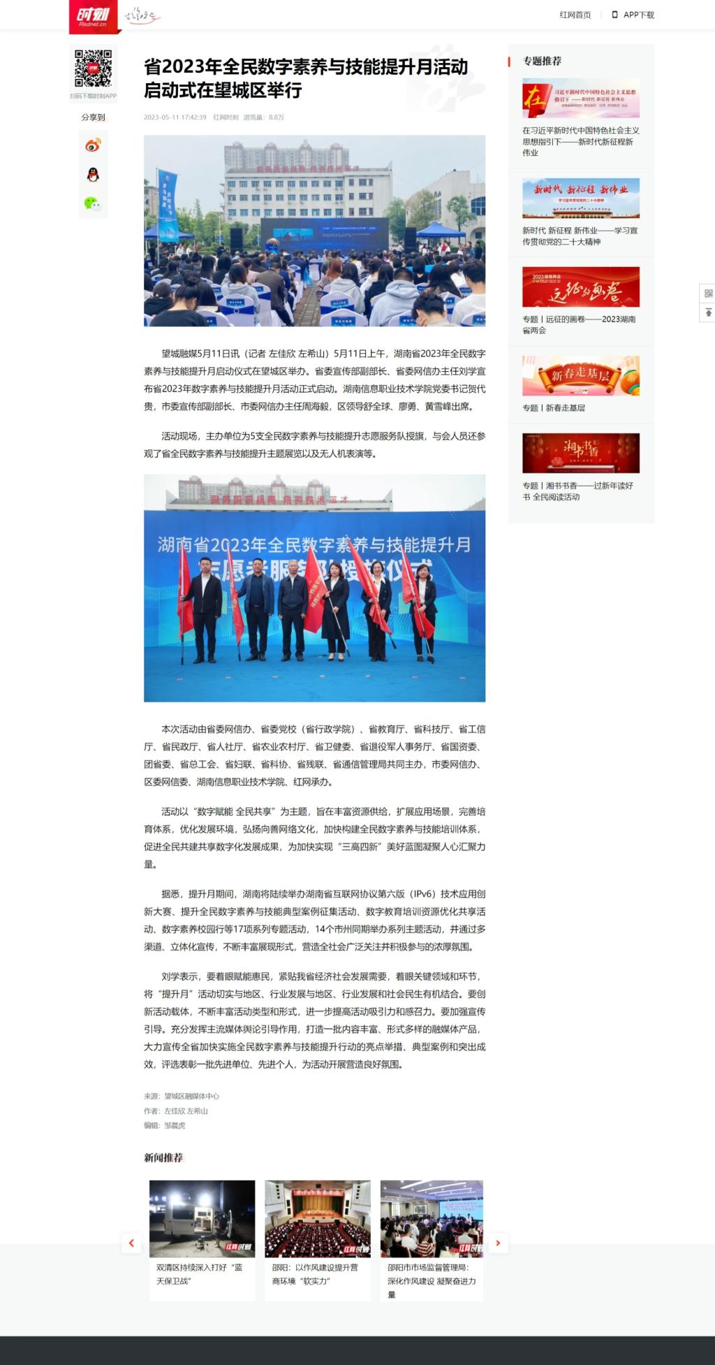 5月11日,红网发布《省2023年全民数字素养与技能提升月活动启动式在望城区举行》