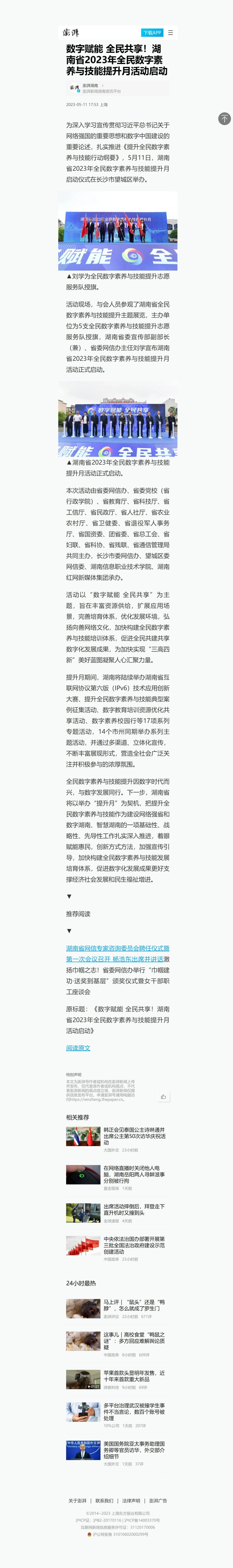 5月11日,澎湃号客户端发布《数字赋能 全民共享!湖南省2023年全民数字素养与技能提升月活动启动》