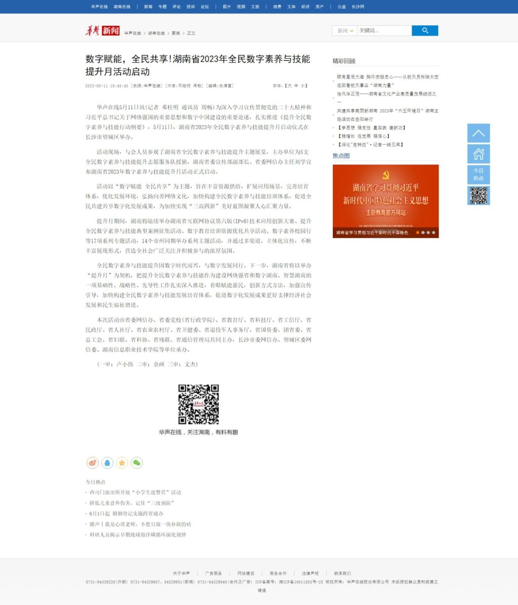 5月11日,华声在线发布《数字赋能,全民共享!湖南省2023年全民数字素养与技能提升月活动启动》
