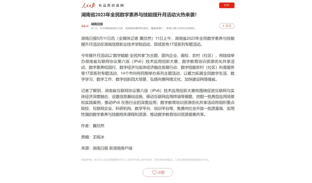 5月12日,人民日报人民号发布《湖南省2023年全民数字素养与技能提升月活动火热来袭!》