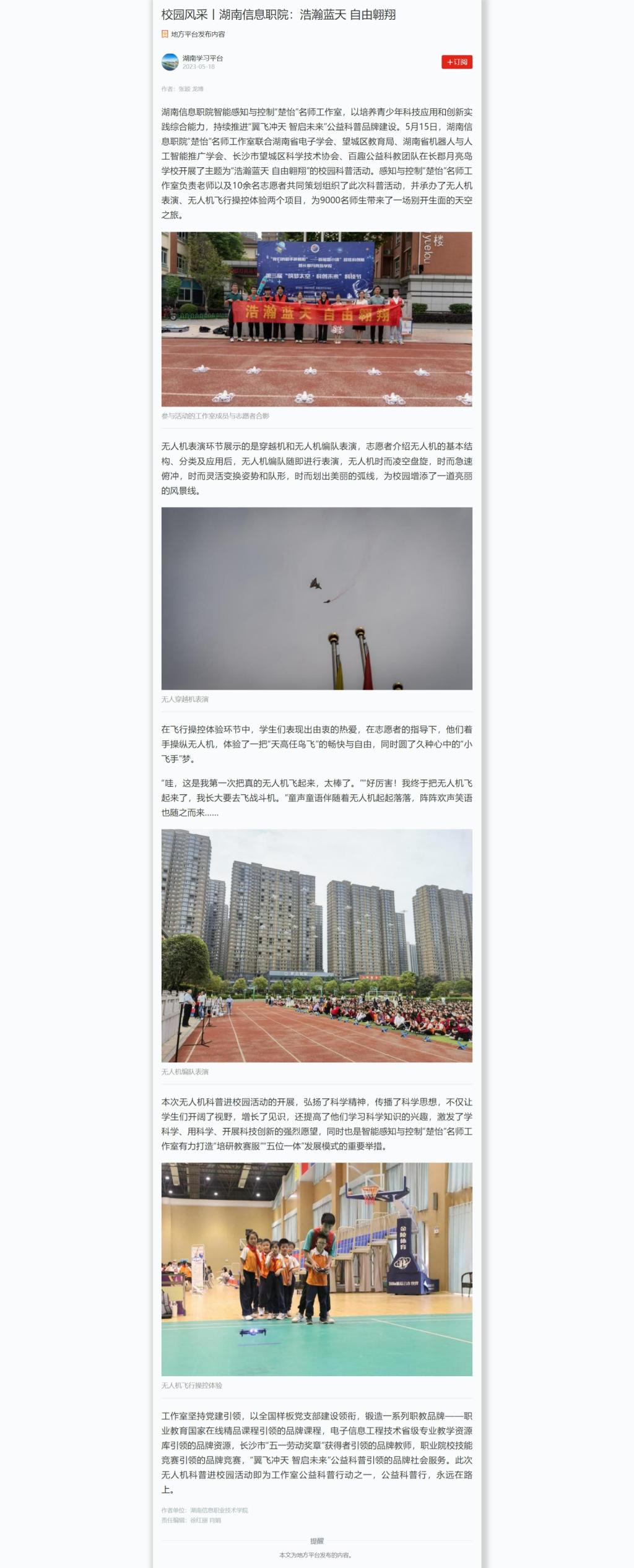 5月18日,学习强国发布《校园风采丨湖南信息职院:浩瀚蓝天 自由翱翔》