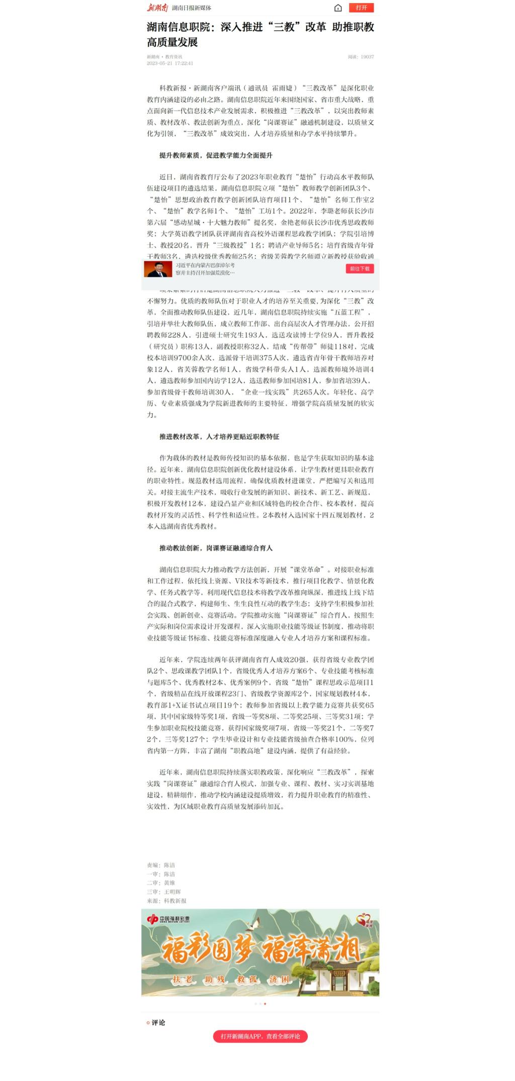 5月21日,新湖南客户端发布《湖南信息职院:深入推进“三教”改革 助推职教高质量发展》