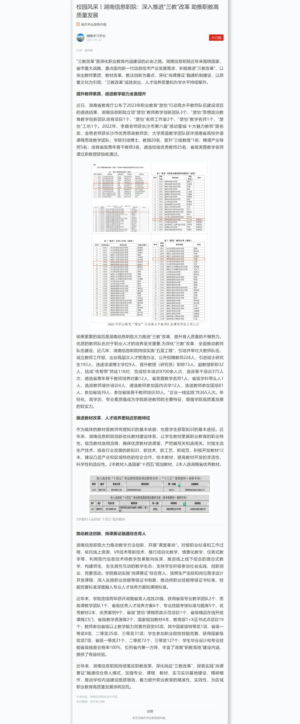 5月22日,学习强国发布《校园风采丨湖南信息职院:深入推进“三教”改革 助推职教高质量发展》