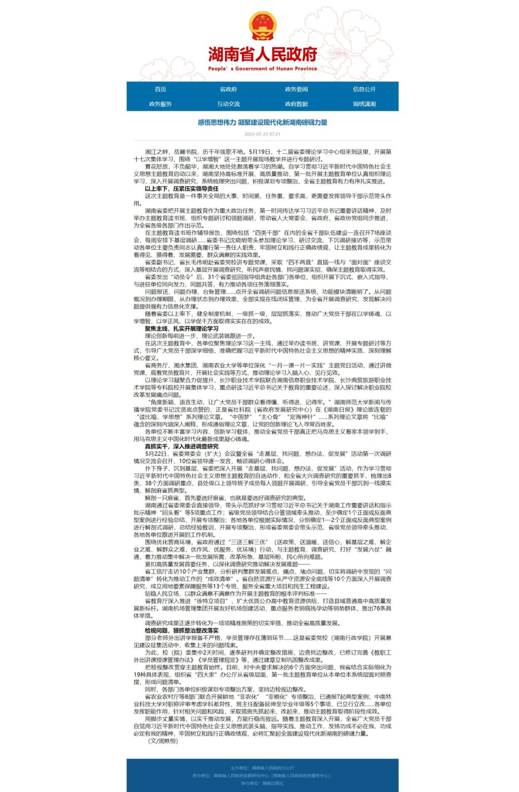 5月25日,湖南省政府门户发布《感悟思想伟力 凝聚建设现代化新湖南磅礴力量》